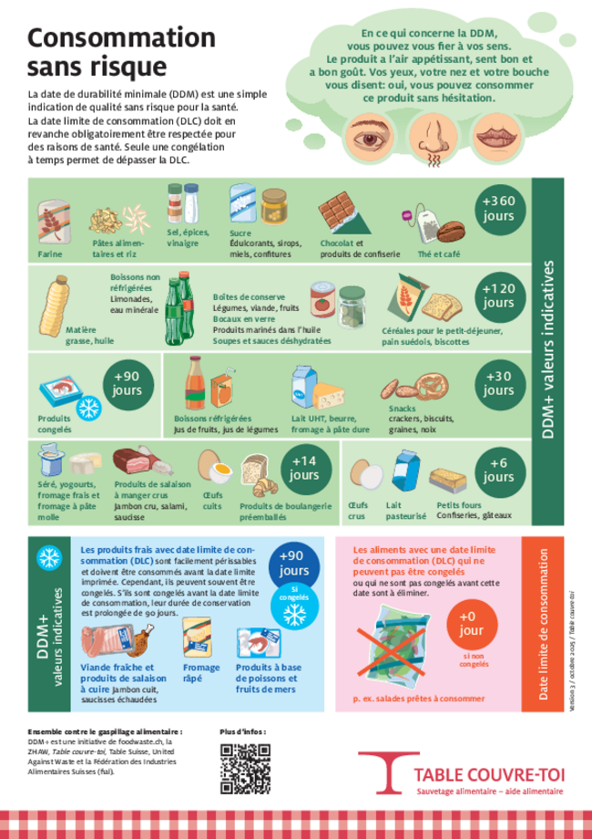 À la demande de l’Office fédéral de la sécurité alimentaire et des affaires vétérinaires (OSAV), des chercheurs de l’Université des sciences appliquées de Zurich (ZHAW) ont élaboré deux guides qui ont été publiés en 2021 : le « Guide pour la réduction des pertes alimentaires liées au datage des denrées alimentaires » et le «Guide pour la réduction des pertes alimentaires lors de la remise des denrées alimentaires». En s’appuyant sur la loi fédérale sur les denrées alimentaires en vigueur, les décrets correspondants et les deux guides scientifiques, le groupe de travail Foodsave2025 a élaboré la fiche d’information condensée « Consommation sans risque », un guide qui indique la marche à suivre concernant les produits dont la DDM et la DLC sont dépassées.