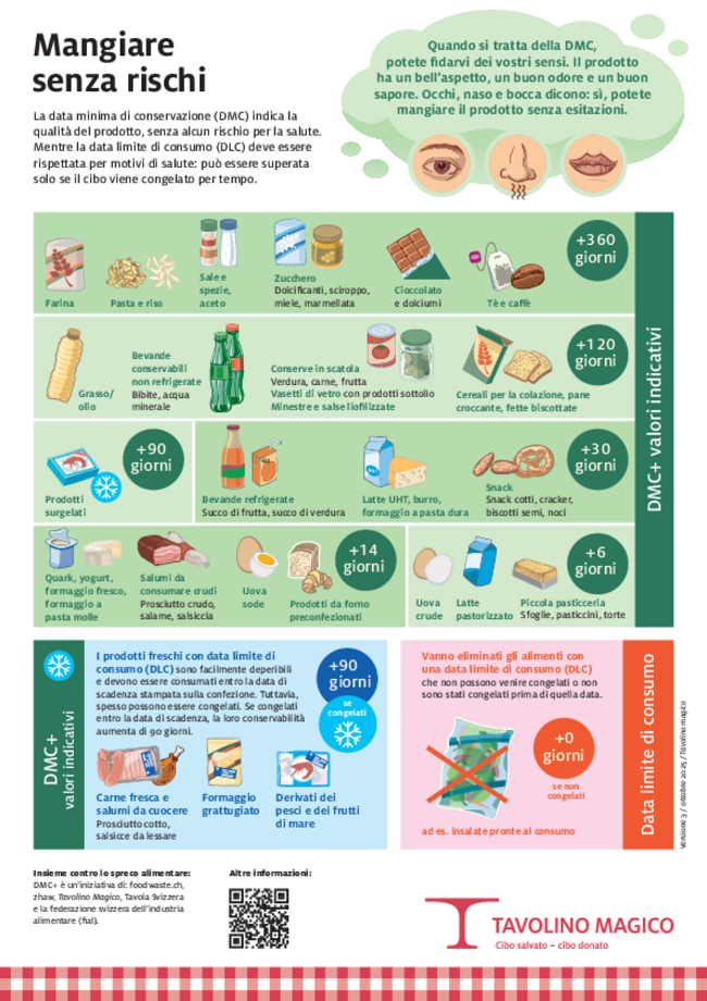 Per questo motivo, su incarico dell’Ufficio federale della sicurezza alimentare e di veterinaria (USAV), i ricercatori dell’Università di Scienze Applicate di Zurigo (ZHAW) hanno elaborato due linee guida, pubblicate nell’aprile del 2021: «la Guida per la riduzione delle perdite alimentari durante la datazione degli alimenti» e «la Guida per la riduzione delle perdite alimentari durante la distribuzione degli alimenti». Seguendo la legge sulle derrate alimentari, le relative ordinanze e le due guide scientifiche, il gruppo di lavoro Foodsave2025 ha sviluppato la scheda informativa riassuntiva «Mangiare senza rischi». Spiega come confrontarsi con le scadenze degli alimenti sia per quanto riguarda la data limite di consumo (DLC) e la data minima di conservazione (DMC).